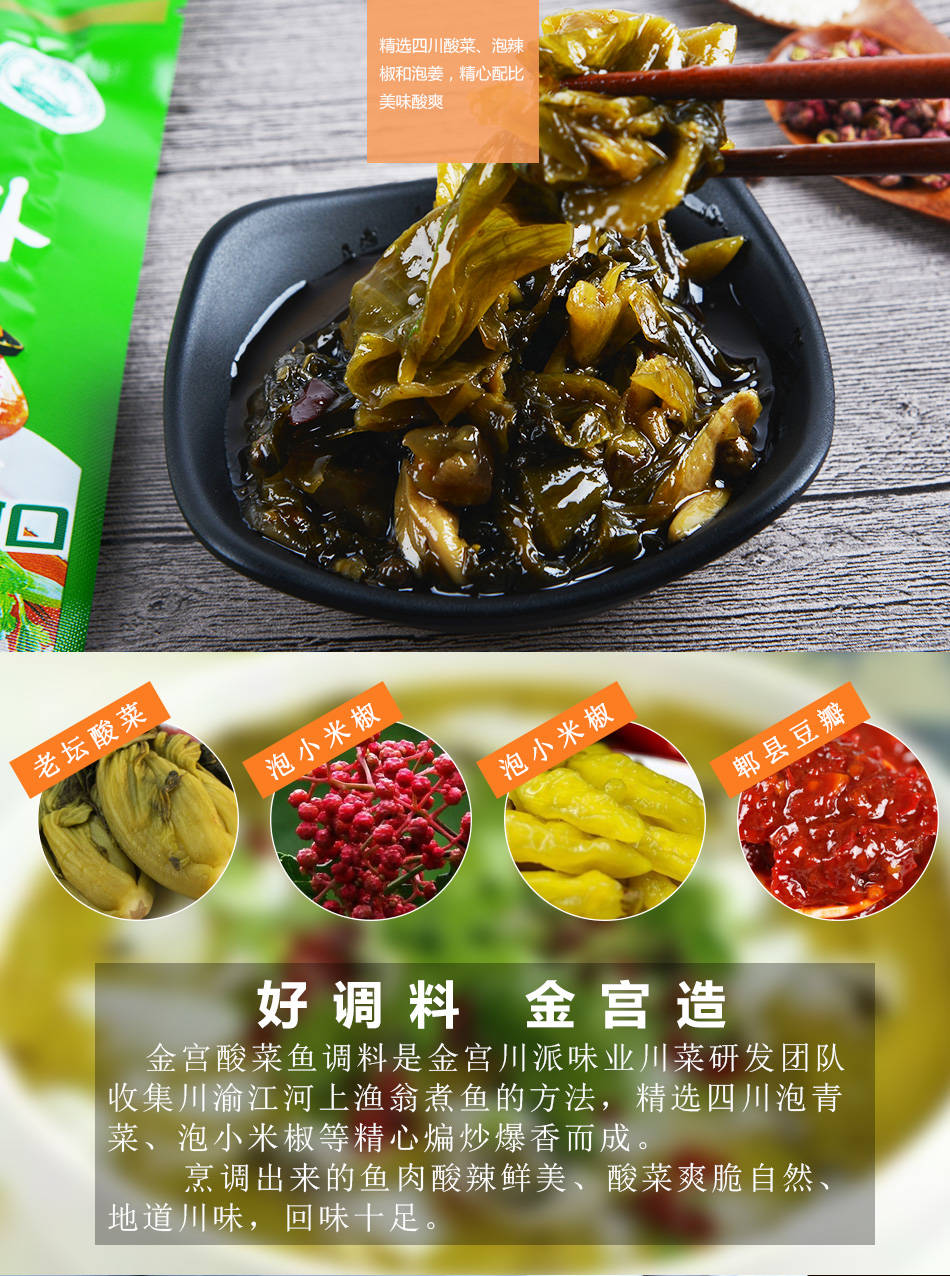 金宮酸菜魚調(diào)料是金宮川派味業(yè)川菜研發(fā)團隊收集川渝江河上漁翁煮魚的方法,精選四川泡青菜、泡小米椒等精心煽炒爆香而成。烹調(diào)出來的魚肉酸辣鮮美、酸菜爽脆自然、地道川味,回味十足。
