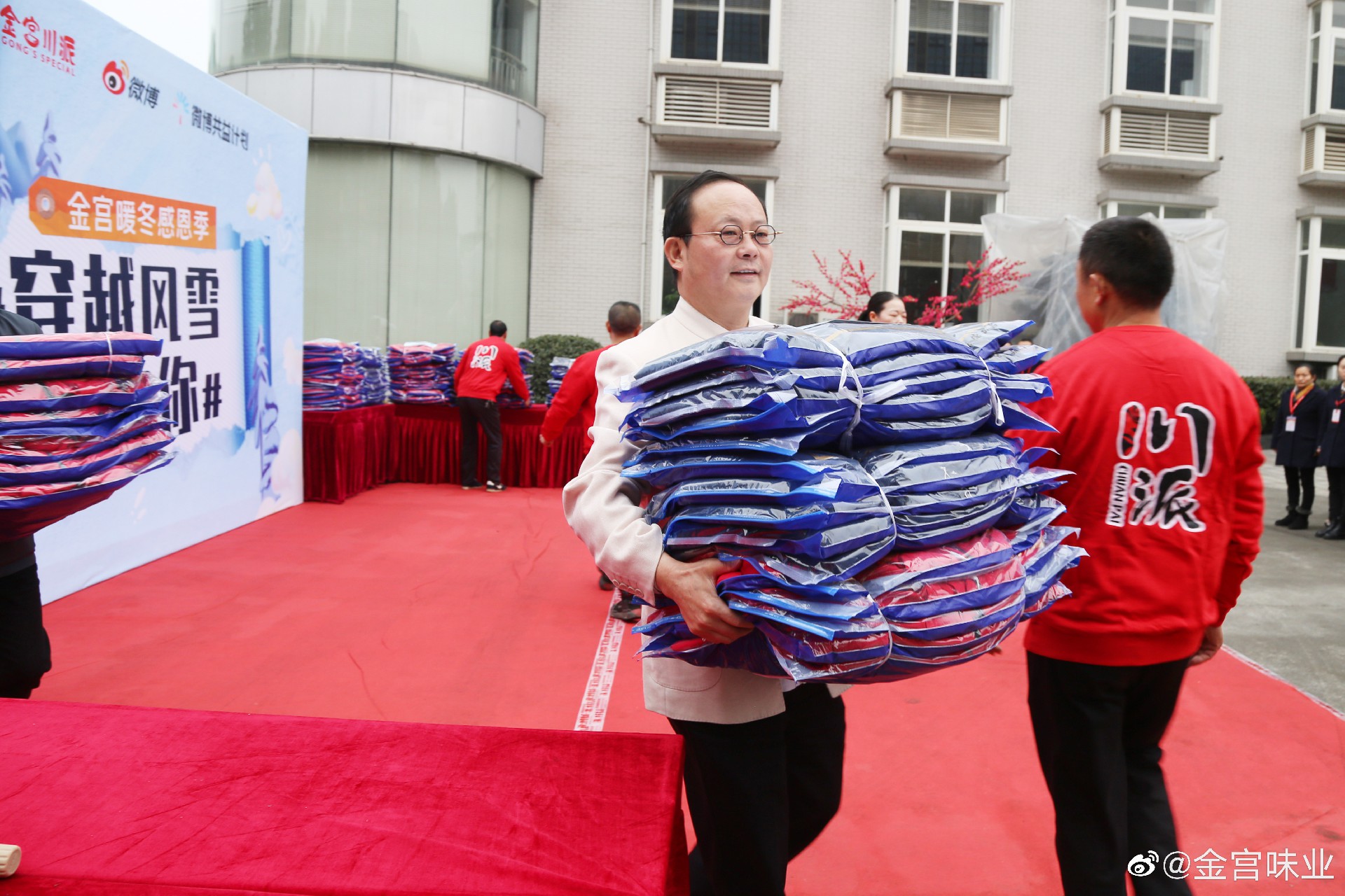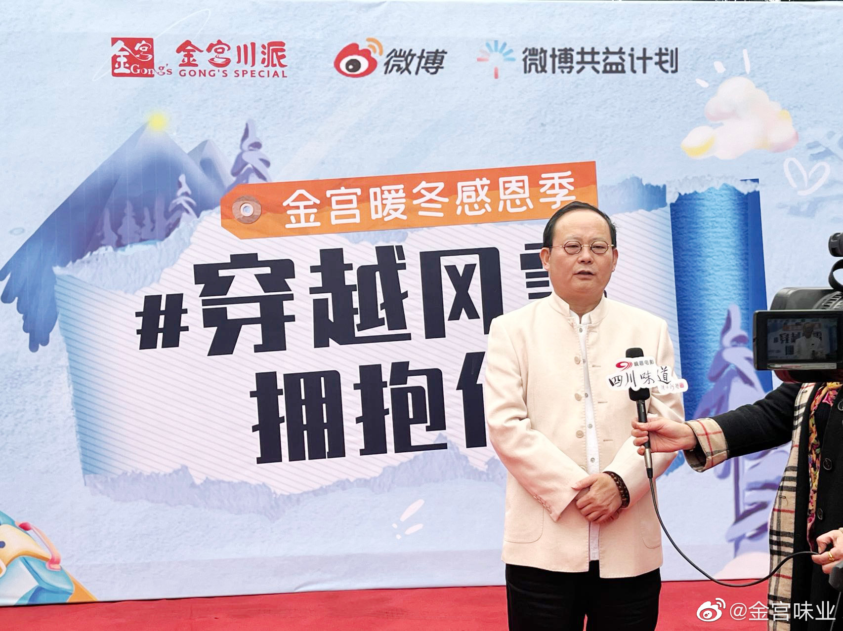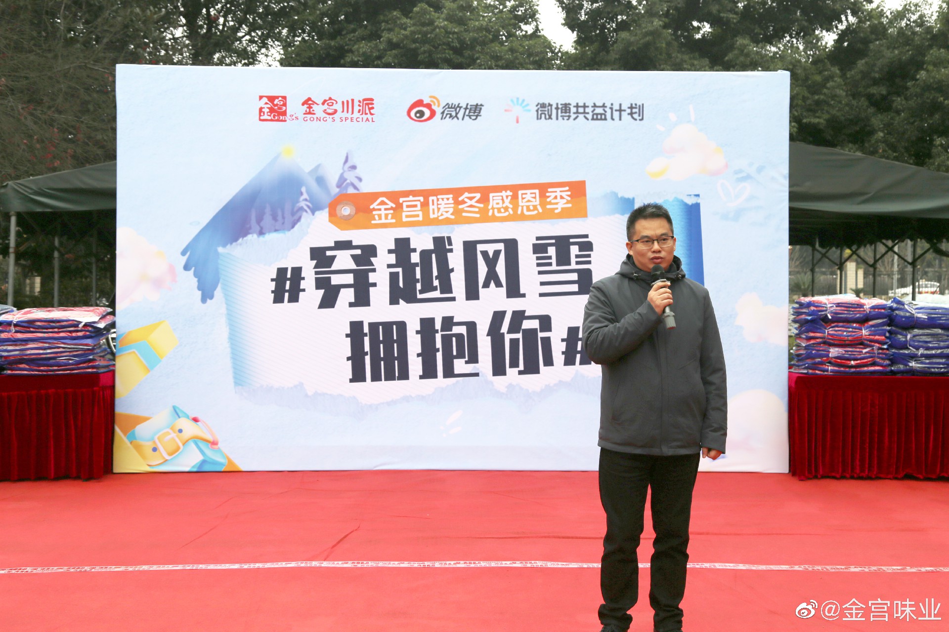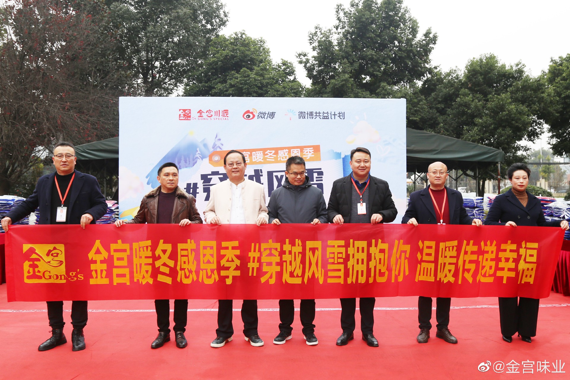 2022年1月7日,由新浪微公益,聯合中國天氣、微博政務等多個平臺共同發(fā)起的暖冬公益項目—穿越風雪擁抱你之金宮暖冬感恩季公益捐贈活動,在四川金宮川派味業(yè)有限公司舉行發(fā)車儀式,新浪四川副總經理湯叢陽、四川電視臺峨眉電影頻道《四川味道》欄目總制片人鐘偉以及金宮集團董事長龔永澤、四大中心員工代表共同參與見證了此次活動。