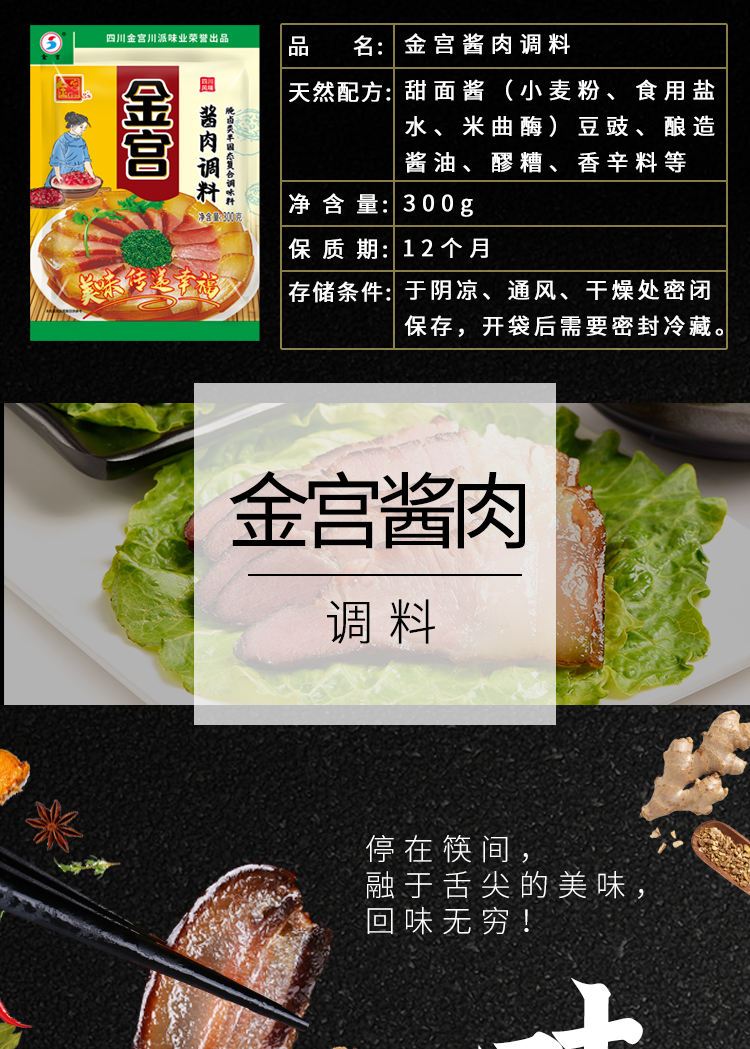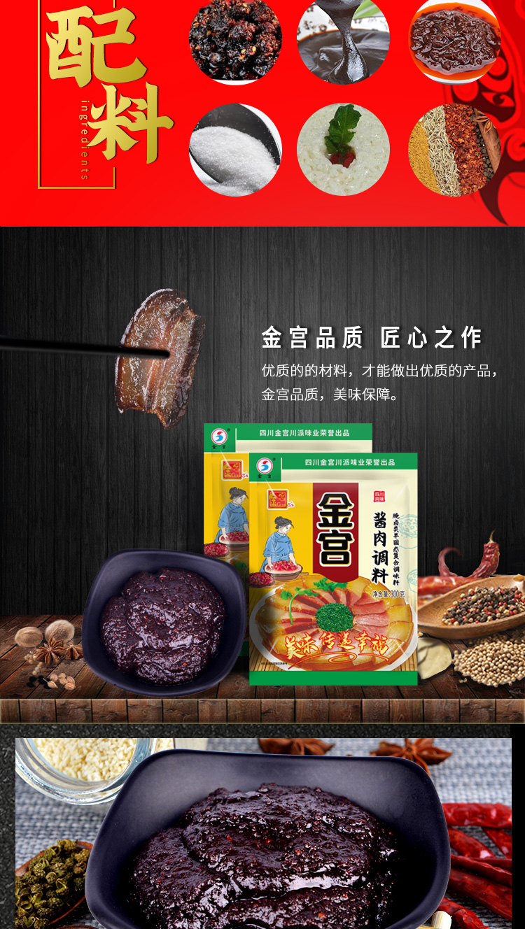 產(chǎn)品簡介:本品精選多種四川本地優(yōu)質(zhì)原料,用本調(diào)料制作的醬肉充分體現(xiàn)了醬香濃郁、肥而不膩、瘦而不柴、滋味鮮美的特點(diǎn),是家庭、食堂、餐廳制作四川醬肉的上乘調(diào)料。