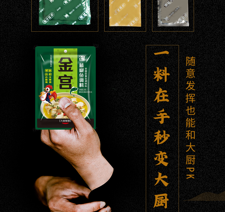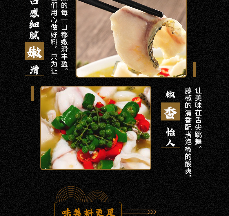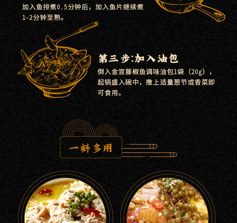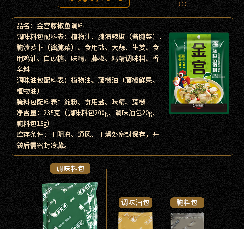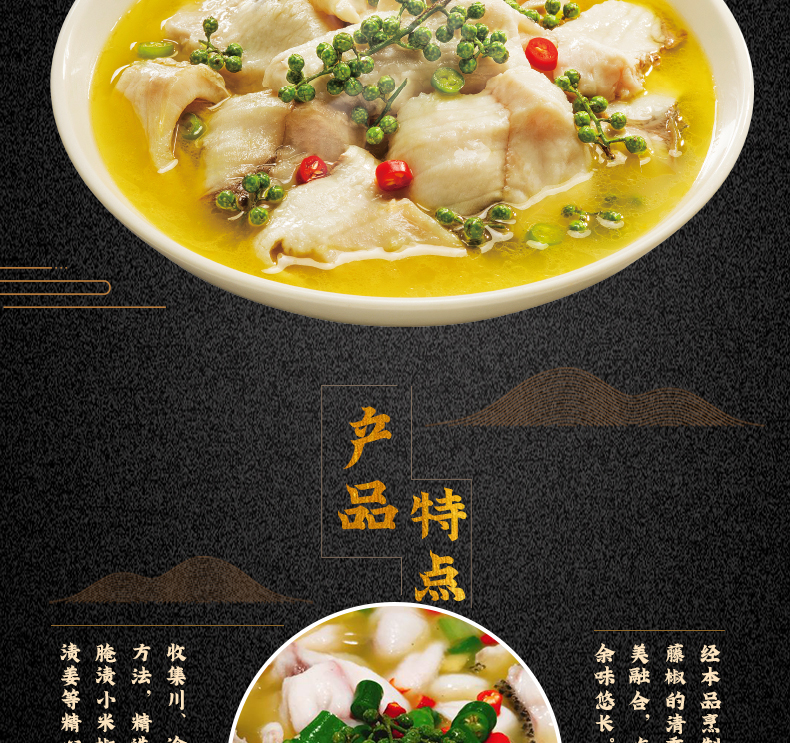 產(chǎn)品簡(jiǎn)介:本調(diào)料是金宮川派公司川菜研發(fā)團(tuán)隊(duì)收集川.渝江河上漁翁煮魚的方法,精選優(yōu)質(zhì)藤椒,四川泡小米椒,泡蘿卜,泡姜等精心煽炒爆香而成。經(jīng)本品烹制的魚,湯鮮魚嫩,藤椒的清香與魚肉的鮮香完美融合,吃起來鮮麻勁爽,余味悠長(zhǎng)。